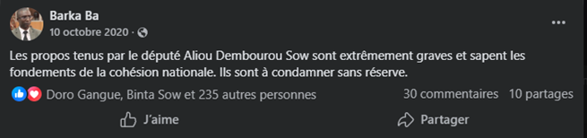 Capture d’une publication qui s’indigne des propos d’Aliou D. Sow